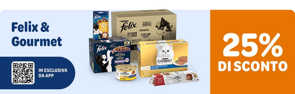 - Scegli gli alimenti Gourmet e Felix che preferisci, tra umidi, crocchette e snack