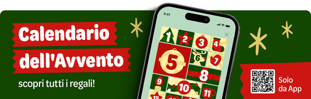 *Le promozioni del calendario dell'avvento sono valide dal 01.12.2024 al 24.12.2024 alle 23:59. Esclusivamente sull'app zooplus. Per giocare è necessario l'ultimo aggiornamento della app. Ogni codice coupon è valido solo per la giornata in corso. È necessario attivare la promozione per ricevere lo sconto. I codici coupon non possono essere combinati con altri coupon o promozioni. Lo sconto più conveniente sarà automaticamente applicato al carrello. Ogni coupon è limitato a un uso per cliente.
