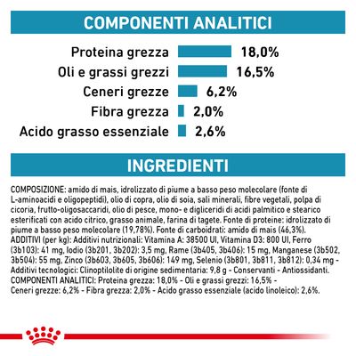 Componenti delle crocchette per cani Royal Canin Veterinary Canine Skin Care Small Dog: