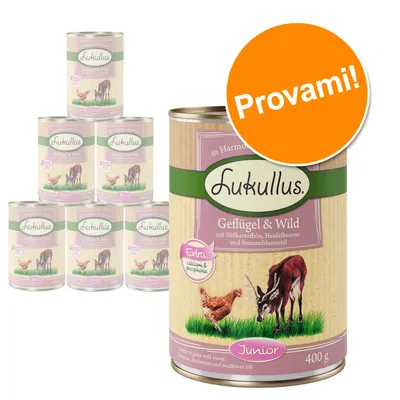 Alimento umido per cani Lukullus Junior con proteine animali, componenti vegetali e oli pregiati, soddisfa le esigenze dei cuccioli e cani junior Nuovo design, stessa ricetta! - ora in conveniente set prova misto da 6 x 400 g!