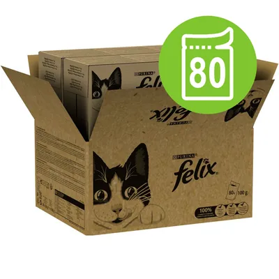 Il Pacco scorta Felix in buste 80 x 85 g è una selezione di alimenti umidi Felix in buste per gatti che contiene tante diverse varianti per offrire ogni giorno una novità nella ciotola tuo gatto.